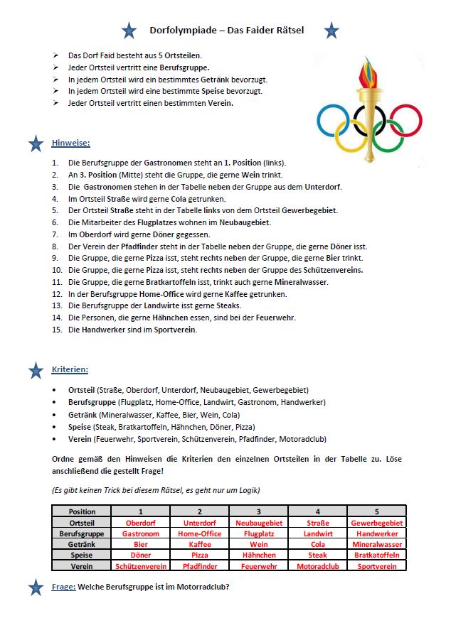 Kreativität haben unsere Olympioniken bereits bewiesen, diesmal war Köpfchen dran. Soviel vorweg, alle angetretenen Teams haben die Aufgabe mit Bravour gemeistert. Welchen Ehrgeiz sie dabei an den Tag legten, das konnte ich am Mittwochmorgen aus meinem Bürofenster selber beobachten. Das Komiteemitglied Manuel Meyer musste sich beim Aufhängen des Rätsels tatsächlich den Weg zur Türe des Kindergartens durch dort bereits campende Teammitglieder bahnen. Nachdem die Aufgabe dann um 07:39 Uhr hing, kamen nach Aussagen des Komitees bereits um 08:00 Uhr die ersten Ergebnisse rein. Zu den ersten Einsendenden gehörten auch die beiden Gruppen des Kindergartens selbst. Erste Unsicherheiten kamen im Komitee auf. Von Zweifeln gequält, lief der Verantwortliche Manuel Meyer zurück, um sicherzustellen, nicht doch die Lösung aufgehangen zu haben. Fehlanzeige. Sollte das in tagelanger Kleinarbeit durch den Ortsbekannten Mathematikprofessor Martin B. erstellte Rätsel zu einfach sein? Niemals. Daher einigte man sich im Orga-Team, wohl auch um eine etwaige Fehlbarkeit zu vertuschen, auf die besondere Intelligenz der Teams. Meine Meinung, es lag selbstverständlich nur an der überdurchschnittlichen Cleverness der Olympioniken, auf die wie ich hörte, die gute Faider Luft einen nicht unwesentlichen Einfluss haben soll. Das teste ich selbst und gehe eine Runde spazieren.