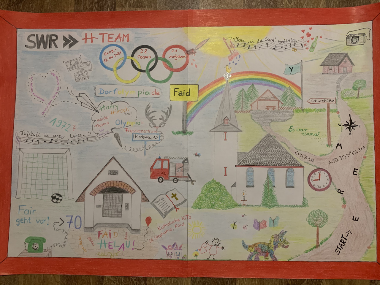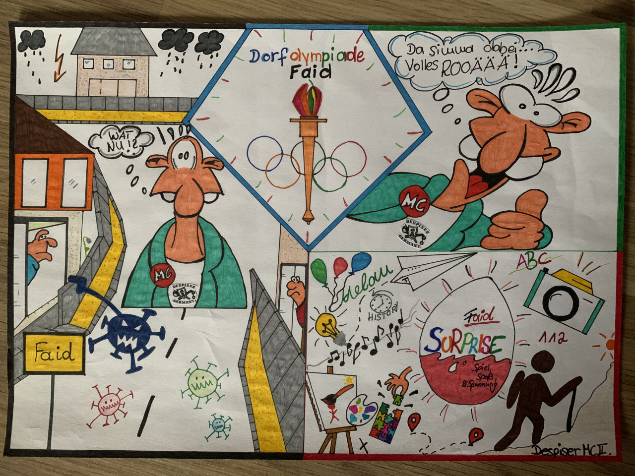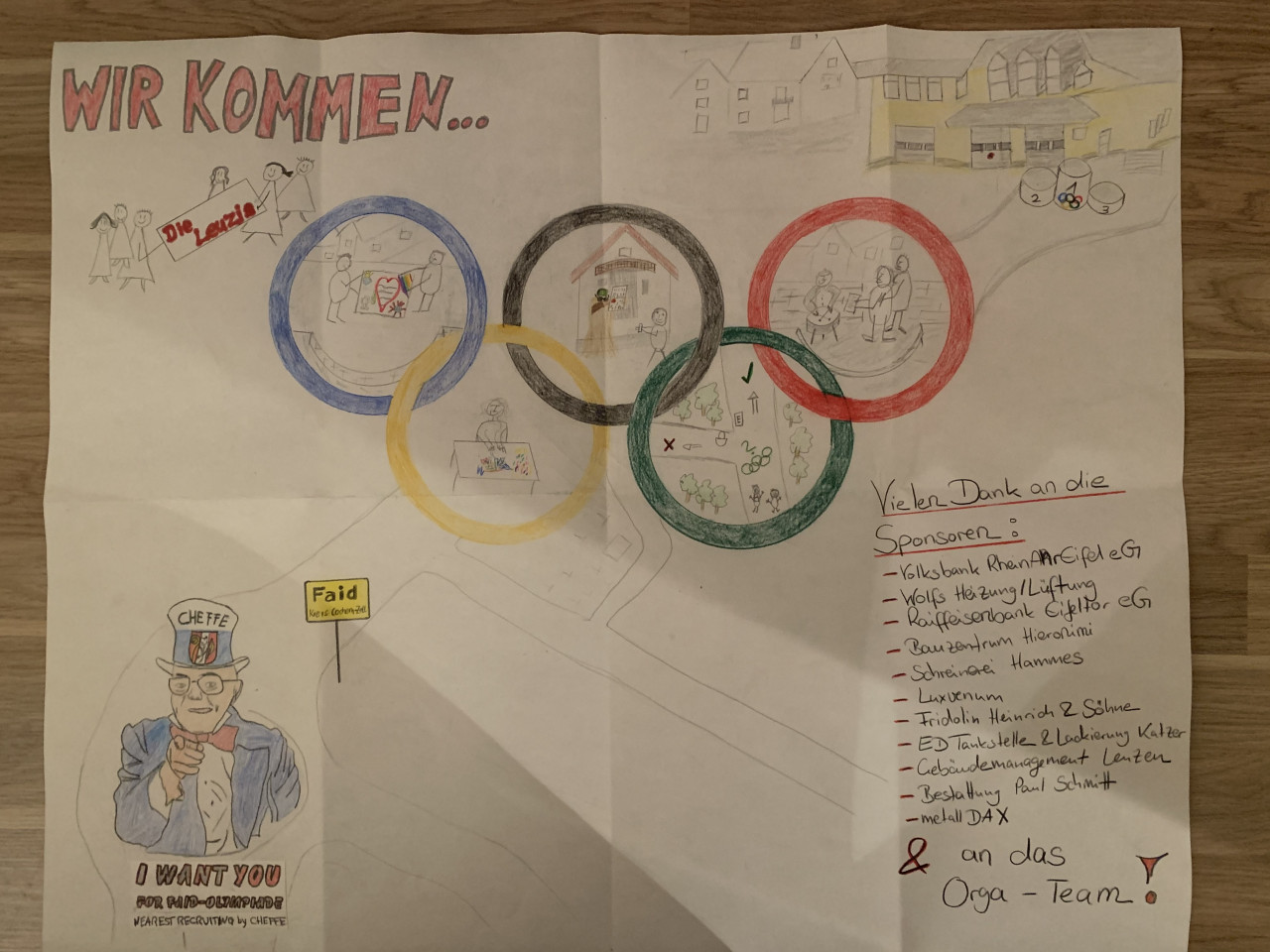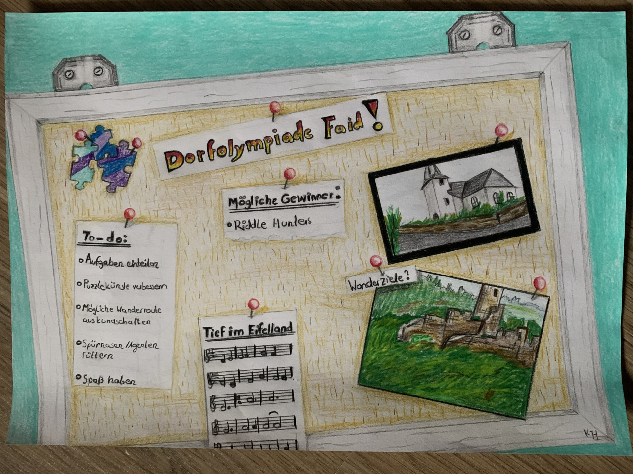 Heute mussten die Teams das erste mal ihre Kreativität mit künstlerischen Fingerfertigkeiten vereinen. Bunte Bilder zum Thema Dorfolympiade galt es zu gestalten. Der Fantasie freien Lauf lassen, etwas, was keinem der Olympioniken schwer viel. Ich denke, heute sprechen die Ergebnisse einmal mehr für sich. Wahre Kunstwerke. Und damit diese für die Ewigkeit erhalten bleiben, gibt es seitens des Komitees bereits Ideen, die Bilder entsprechend zu präsentieren. Aber jetzt schaut sie euch erst einmal an.