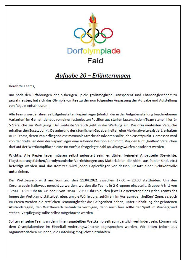 Das Komitee bat mich noch, eine Änderung zu Aufgabe 20 weiterzuleiten. Eine E-Mail mit dieser Änderung ist bereits an alle Teams versendet worden, sagte man mir. Flugwettbewerb zentral an einem Ort, klingt nach einer spannenden Geschichte für mich, da bin ich auf jeden Fall dabei.